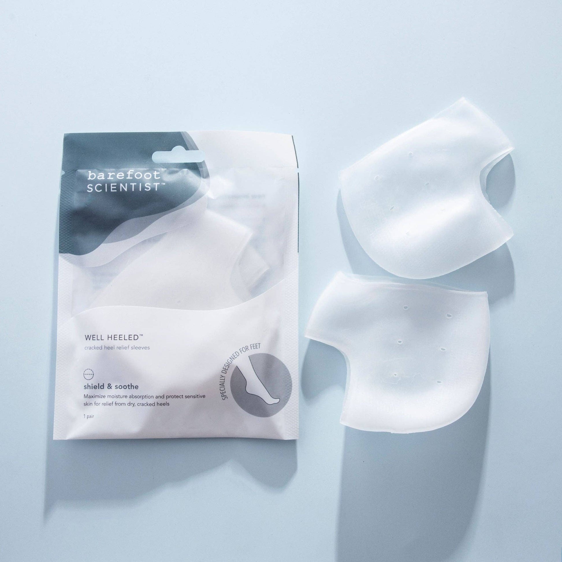 Well Heeled™ is a set of protective sleeves that maximize moisture absorption and protect sensitive skin for effective relief from dry, cracked heels.